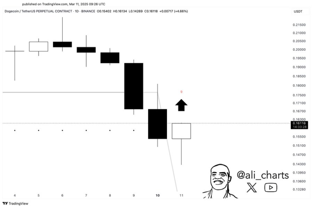 Ali's technical analysis reveals a buy signal from the TD Sequential indicator on Dogecoin's daily chart. The indicator recently completed a nine-candle sequence (indicated by a red "9" on the chart), typically signaling the end of a downtrend.