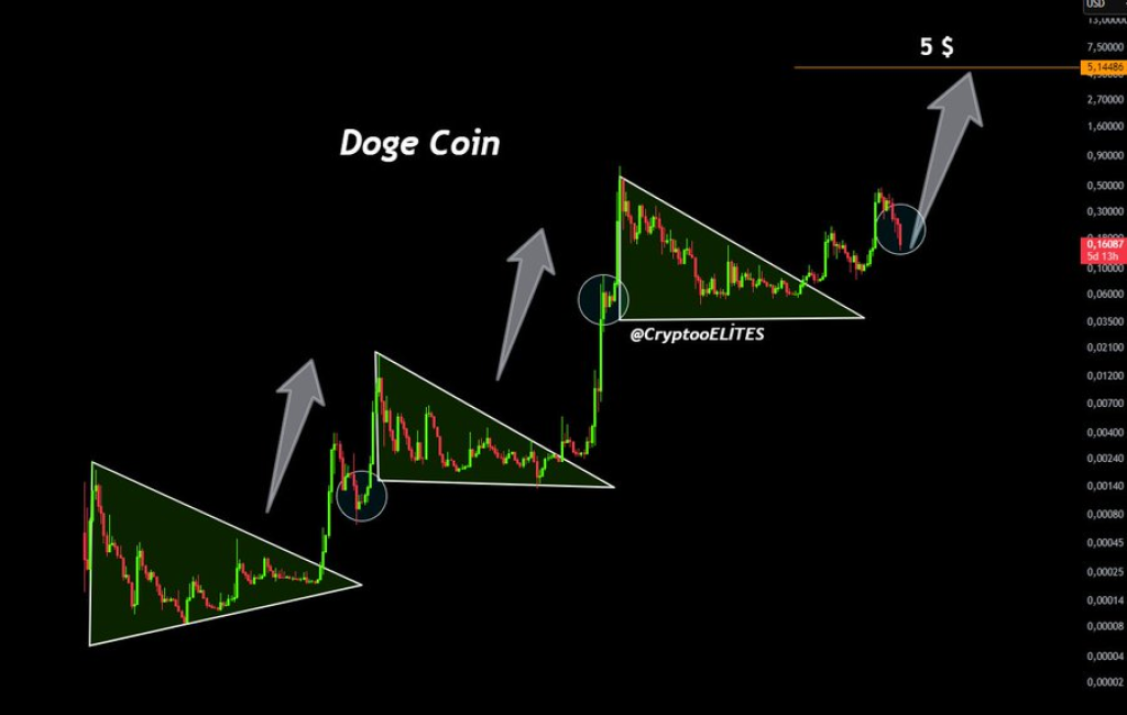 The current chart suggests Dogecoin is forming another such pattern. Based on previous breakouts, @CryptoELlTES projects a long-term target as high as $5 for the meme coin.