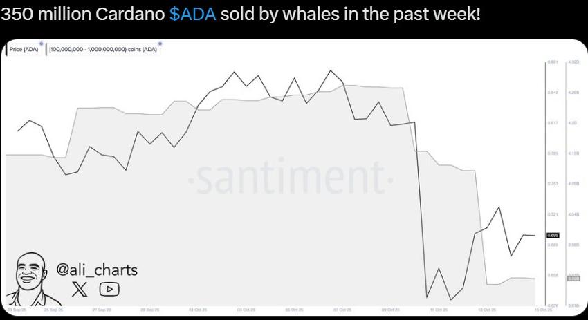 A 15% weekly drop in Cardano (ADA) resulted in a rapid price drop after whales sold 350 million tokens. The coin is currently trading at $0.69 with a major support level of $0.53 to $0.71. This area has served as a robust foundation historically, and it has resisted deeper regressions in the previous market cycles.