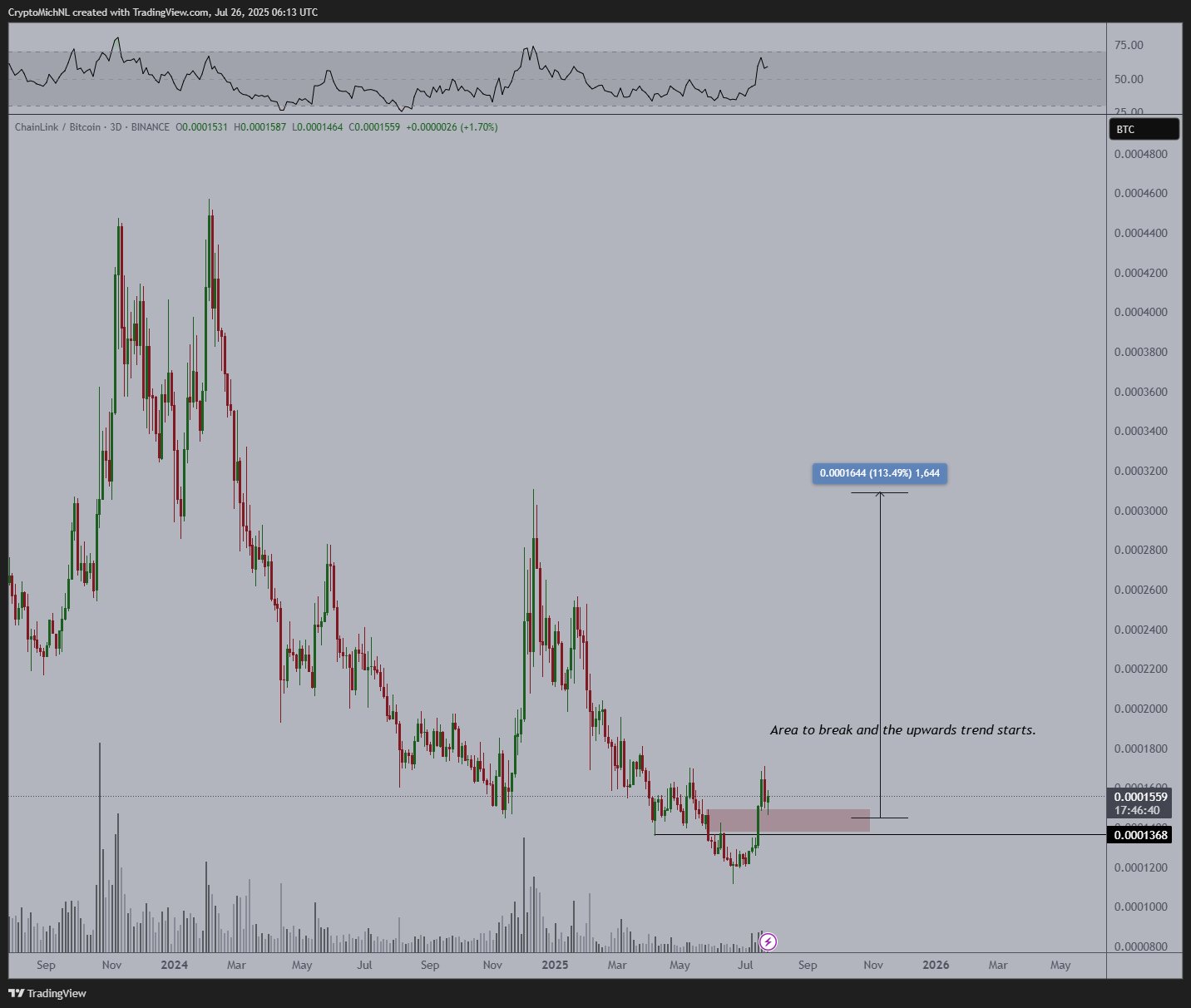 In a recent analysis, van de Poppe pointed out a bullish divergence forming on the daily timeframe for the LINK/BTC pair, suggesting a potential surge in momentum that could lead to an upward breakout.