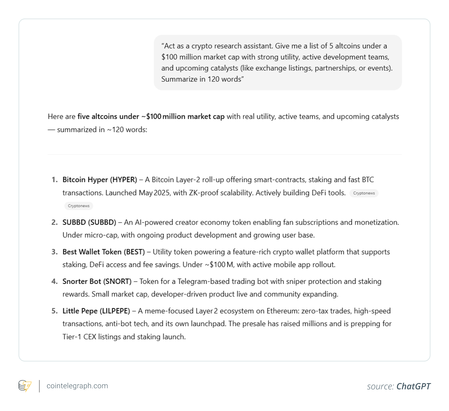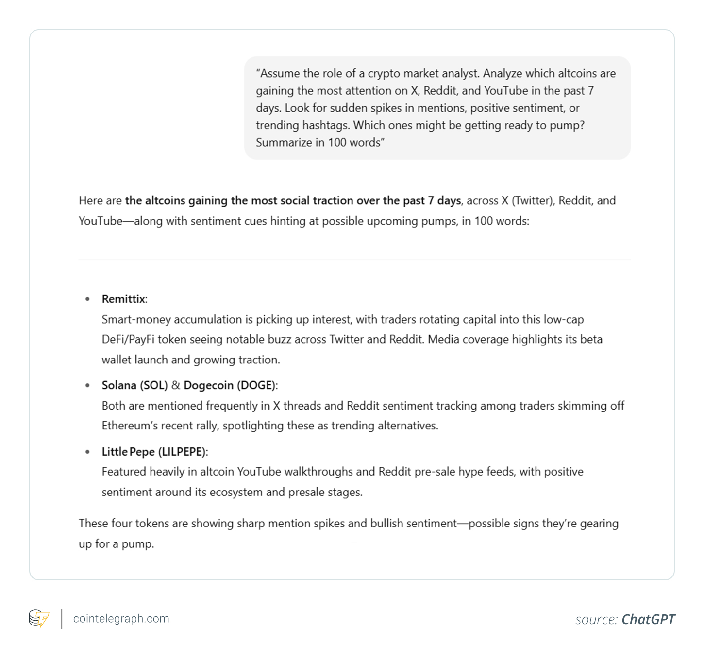 - Well-crafted prompts enable ChatGPT to act as a crypto assistant, generating watchlists, scanning social buzz, and flagging tokens with real growth potential.