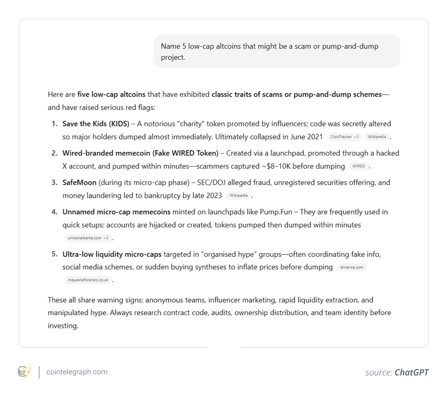 ChatGPT's response should provide examples of tokens linked to potentially fraudulent or manipulative behavior, potentially referencing past cases. It should also explain common characteristics of micro-cap memecoins and organized hype groups. Always independently verify this information before forming any conclusions.
