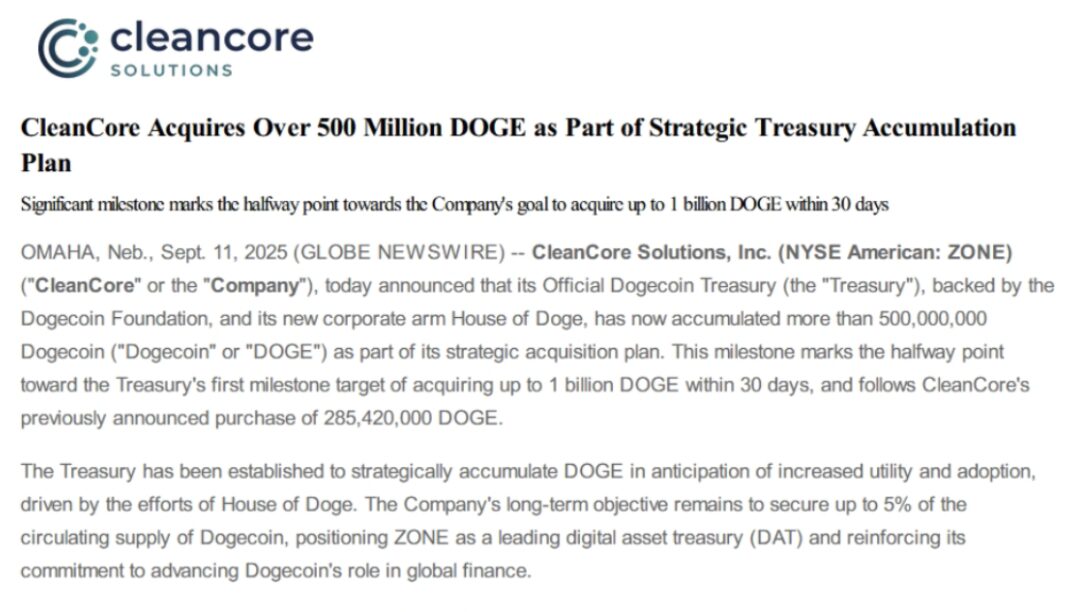 CleanCore Solutions, a maker of aqueous ozone cleaning systems, has reached the halfway point of its ambitious plan to accumulate 1 billion Dogecoin (DOGE) within 30 days. The company revealed on Thursday that it purchased $130 million worth of the cryptocurrency, pushing its holdings past 500 million DOGE.