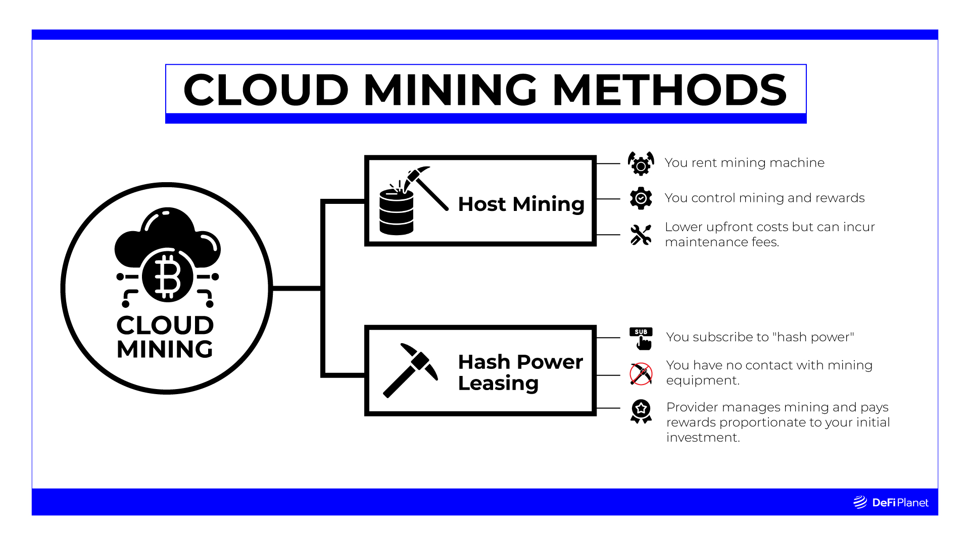 omers access to crypto mining infrastructure in two main ways. They either offer full physical access to the equipment (host mining) or assure users of a share of the mined tokens proportional to the amount of “hash power” they paid for.