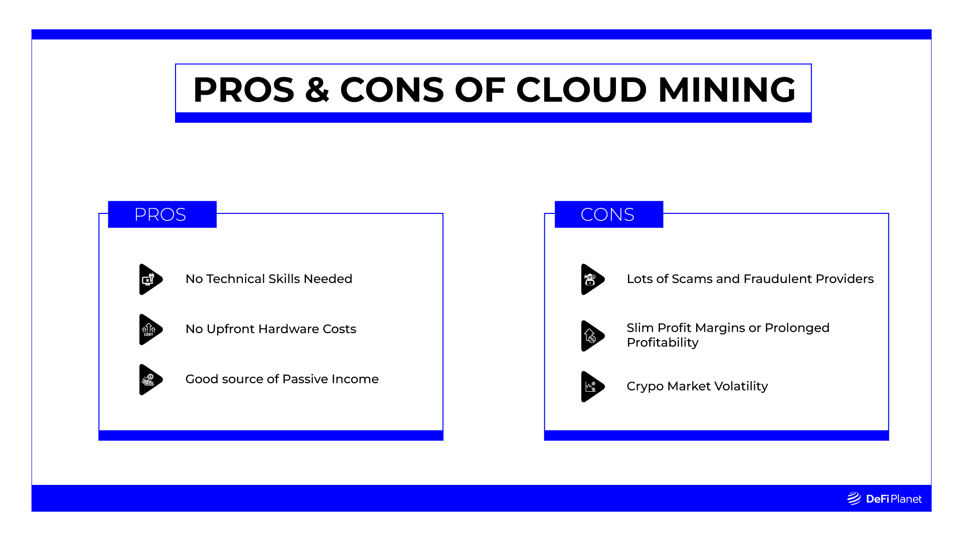 Despite its convenience, cloud mining may yield lower profits due to the fees charged by service providers. Their desire to make a profit often influences the fees they charge. Also, users’ potential profits may be impacted when service providers face financial, legal, or technical issues. The providers are often eager to recoup their investment in mining infrastructure, so users often bear the brunt of these issues. So, it’s possible to see lower returns from cloud mining compared to traditional mining with self-owned own hardware.
