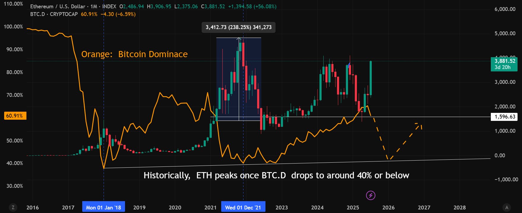 "ETH is poised to surpass $4,000, and market activity is intensifying. Several factors contribute to this momentum. Ethereum has experienced an impressive 80% surge over the past month, but remains 25% below its peak from the 2021 cycle. Historically, for ETH to reach its cycle peak, Bitcoin's dominance needs to decrease to approximately 40%. Currently, Bitcoin's dominance is on a downward trajectory at 61%. The last instance of this trend saw ETH appreciate by over 200%. Furthermore, substantial capital is flowing into ETH weekly through ETFs and publicly-traded companies. Investor sentiment towards ETH remains largely optimistic."
