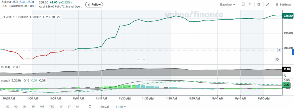 The Solana indicates a sharp upward movement, with the price climbing from approximately $233.91 to $236.20, marking a +2.62% gain. This short-term surge reflects solid buying pressure as the green price line trends strongly upward after a steady base formation earlier in the session. The movement suggests a breakout scenario supported by increasing trader activity.