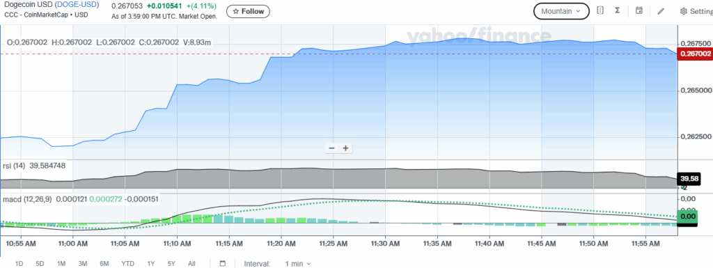 The Dogecoin chart shows a steady intraday climb, with the price rising to $0.26705, a gain of 4.11%. The upward movement is evident through a clear step-like progression, showing consistent demand from early morning to midday. This reflects a well-supported rally rather than a volatile price spike, indicating underlying buying strength.