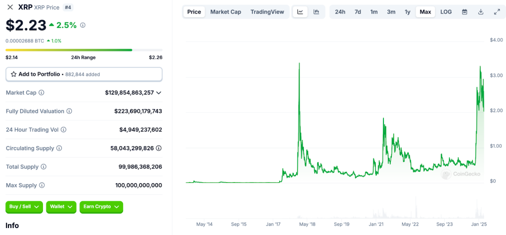 Ripple (XRP), designed by Ripple Labs for cross-border payments, is one of the most widely adopted digital assets in the financial sector. Despite its $129 billion market cap (fourth-largest), XRP remains relatively affordable at approximately $2.23 per coin.