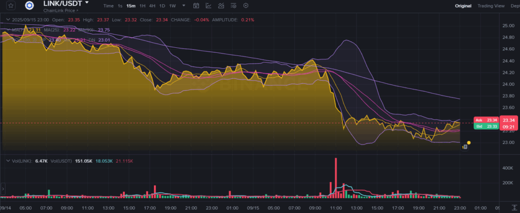 However, lower trading activity later in the day indicated stabilization attempts. This balance of pressure and recovery reflects a consolidating market phase. For Chainlink, breaking above $23.75 remains necessary to reverse the ongoing bearish bias.