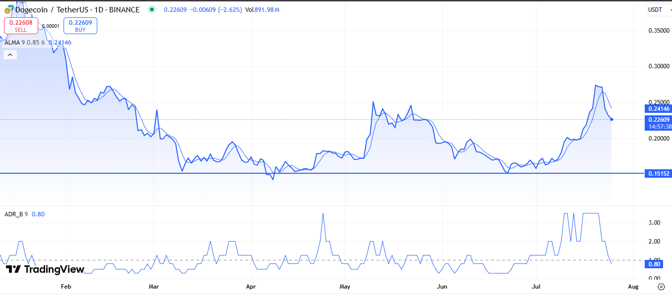 Dogecoin has experienced a sharp correction, dropping by approximately 22% and erasing much of its recent gains. The token initially surged above $0.28 but quickly retreated to the $0.24 range. Despite surpassing the 50, 100, and 200 EMAs during its rally, DOGE was unable to sustain its upward momentum. The decline followed overbought RSI readings and was accompanied by increased trading volume.