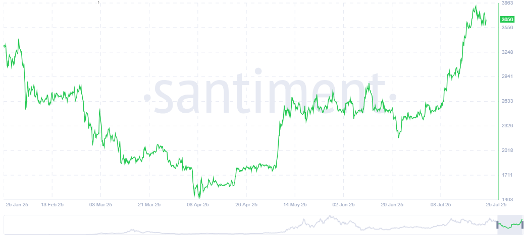 Ethereum continues to outperform, maintaining its upward trend while SHIB and DOGE face downward pressure. After breaking through resistance near $2,700, ETH has climbed to nearly $3,900, supported by consistent trading volume. The price is currently holding above key support zones around $3,500.