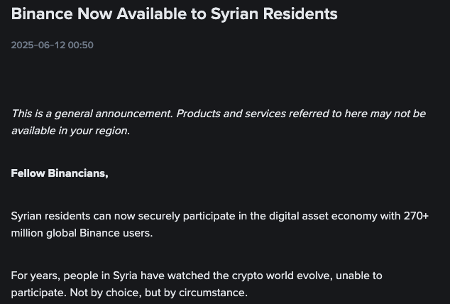As of June 12, Syrian residents can now access the Binance platform and engage in the trading of various crypto assets, including Bitcoin (BTC).