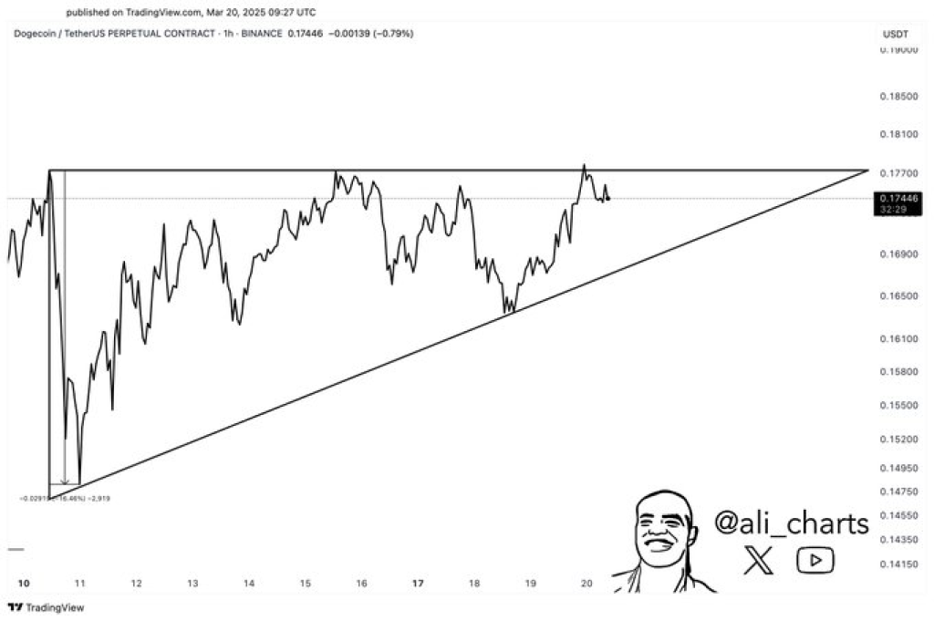 The market awaits a decisive move beyond the current range. While the ascending triangle pattern suggests a likely upward breakout, confirmation through volume and price action is necessary. Ali's analysis has increased interest in Dogecoin's short-term trajectory.