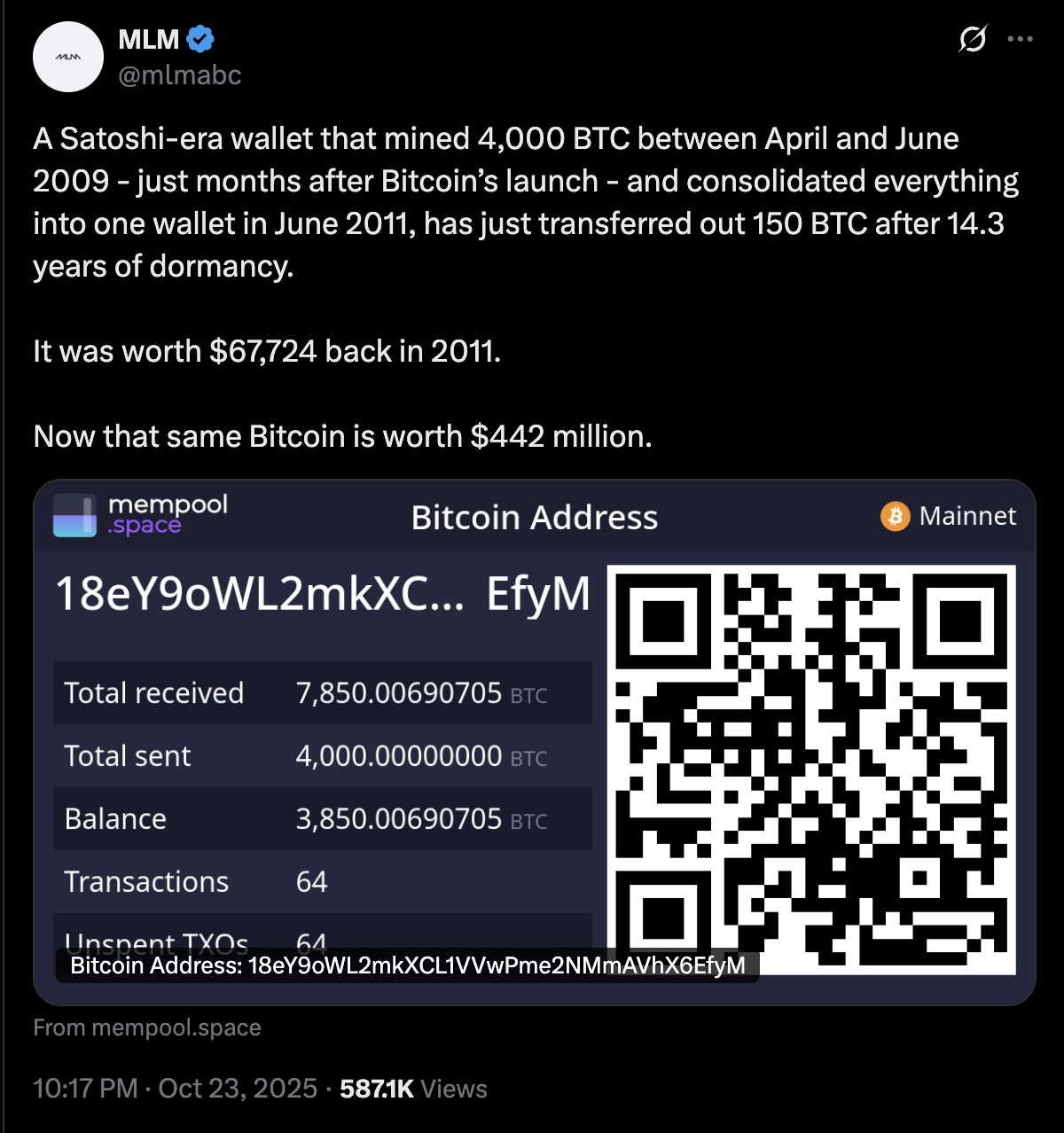Another legendary Bitcoin wallet from the early days of the network has come back to life. A dormant address containing Bitcoin mined between April and June 2009, just months after Bitcoin’s launch, has moved 150 BTC for the first time in 14 years.The wallet was last active in June 2011, when it consolidated 4,000 BTC. According to on-chain data from Whale Alert and Nansen, the address now has over $428 million worth of BTC. The original balance was once believed to be as high as 8,000 BTC.The identity of the wallet owner remains unknown, but analysts like Emmett Gallic suggest the whale has been gradually liquidating BTC across multiple addresses, calling it a “God Level DCA Strat.” Another dormant whale recently transferred over 80,000 BTC to Galaxy Digital in July, also after 14 years of inactivity.Movements from these “Satoshi era” wallets often stir curiosity and speculation in the market. Some traders view them as bearish signals, while others see them as signs of healthy market evolution. Analysts argue that the presence of eager new buyers offsets any selling pressure from early adopters.