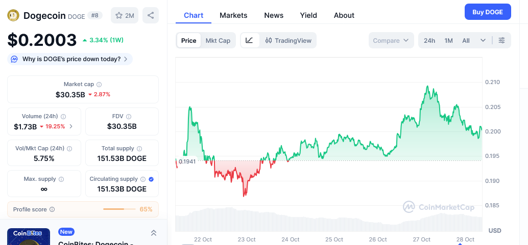 Dogecoin is now one of the most talked-about cheap coins under $1 following the token’s recent price recovery. Like many cryptocurrencies, Dogecoin experienced a dip in mid-October, losing considerable gains in the wake of Bitcoin’s fall to $103k. Bitcoin has since returned to the $114k mark while Dogecoin has recovered after falling to $0.187.As of October 28, Dogecoin’s value stands at $0.2003 following a 3.35% jump over the past week. However, Dogecoin is not fully out of the red zone, so its 30-day price charts show a single-digit decline.Some investors believe that Dogecoin could be among the breakout altcoins with upside potential, with many saying it will capitalize on the next meme coin boom. If investor predictions come true, DOGE could end the year selling at $0.26.