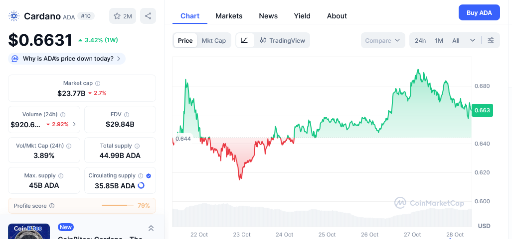 Cardano is now topping altcoin news charts following its sharp price recovery over the past few days. ADA was among the worst-hit tokens in the mid-October market crash. However, its momentum is turning, as shown by its recent uptick.As of October 28, ADA’s price stands at $0.662 following a 3.48% jump over the past week. The 30-day ADA price chart also shows a significant drop, indicating that ADA is still not out of the red zone.Still, many investors are impressed by its recent uptick, with some now concluding that ADA could return to the $0.9 mark in the next bull run. These predictions have been bolstered by expectations that the Federal Reserve would approve additional interest rate cuts before the end of the year.