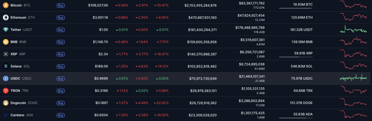 According to CoinMarketCap, Ethereum (ETH) has also slipped 2.50%, down to $3.901, while XRP fell 4% to $2.34. Solana, Cardano, and Dogecoin are also in the red, losing between 3% and 5%.