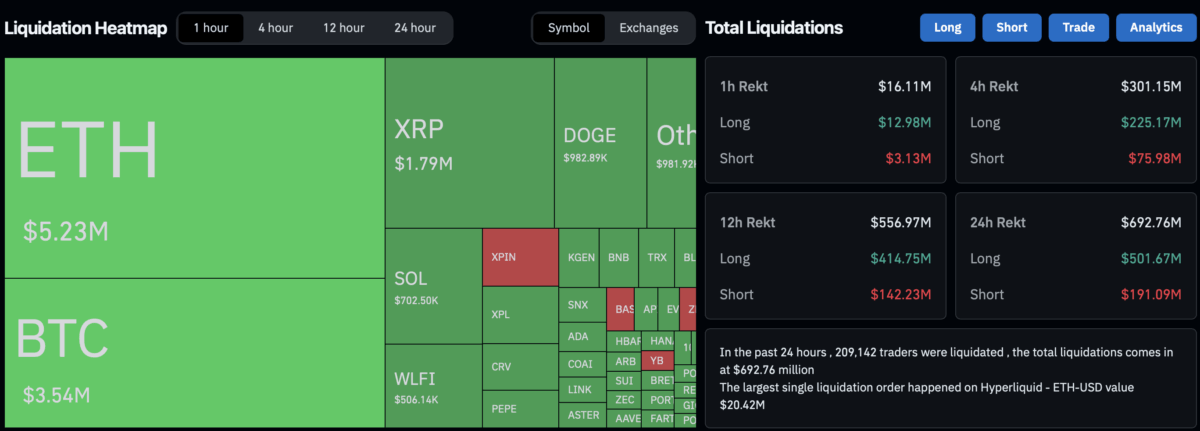 About 209,371 traders were liquidated from the market with roughly $692 million in positions liquidated in the past 24 hours, according to CoinGlass. Meanwhile, this is just a few days after $19 billion was liquidated from the market last weekend that wiped out leveraged traders.