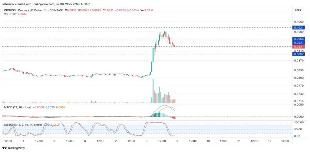 The CRO price has seen a slight pullback of approximately 5% after an impressive surge of over 22%. This surge was triggered by its inclusion in the Truth Social Blue-Chip ETF filing. The token successfully broke above a multi-month consolidation zone and attracted significant trading volume, jumping from around $10 million to as high as $230 million within a few hours.