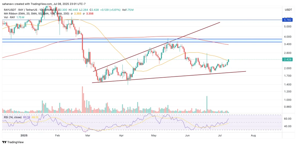 Raydium is steadily climbing, fueled by a significant increase in buying pressure. It is currently trading at $2.42, marking a substantial increase of over 13% in the last 24 hours. The token broke through the $2.3 level with a strong bounce after rebounding from lows around $2.01. This breakout is supported by a substantial rise in trading volume and a clear upward trend.