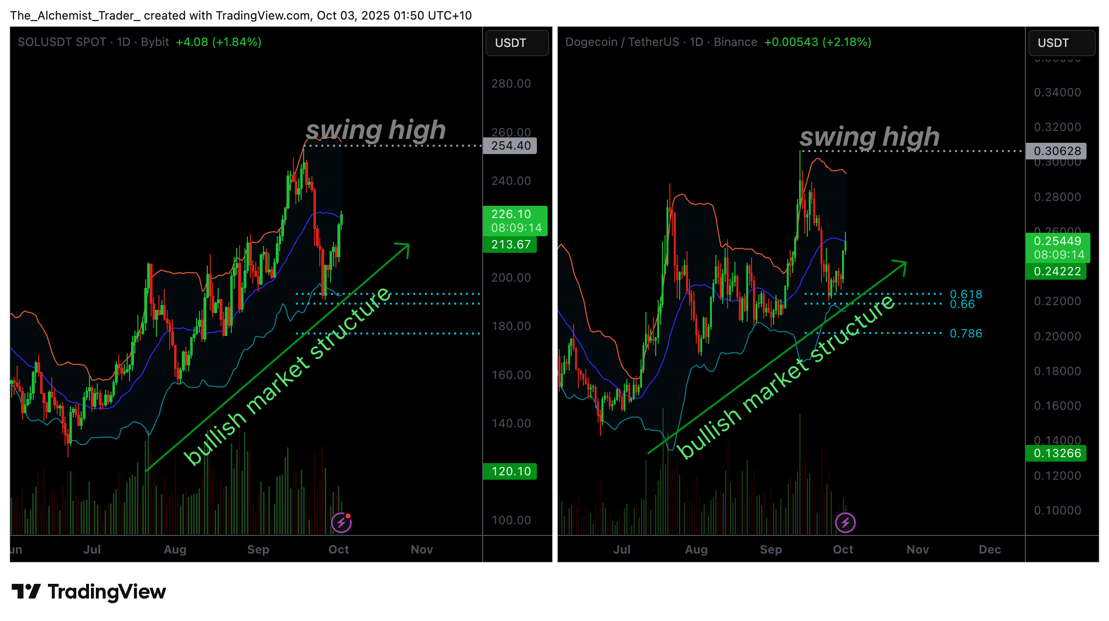 - Solana and Dogecoin rallied from the 0.618 Fibonacci retracement while respecting the lower Bollinger Band, preserving bullish structures.