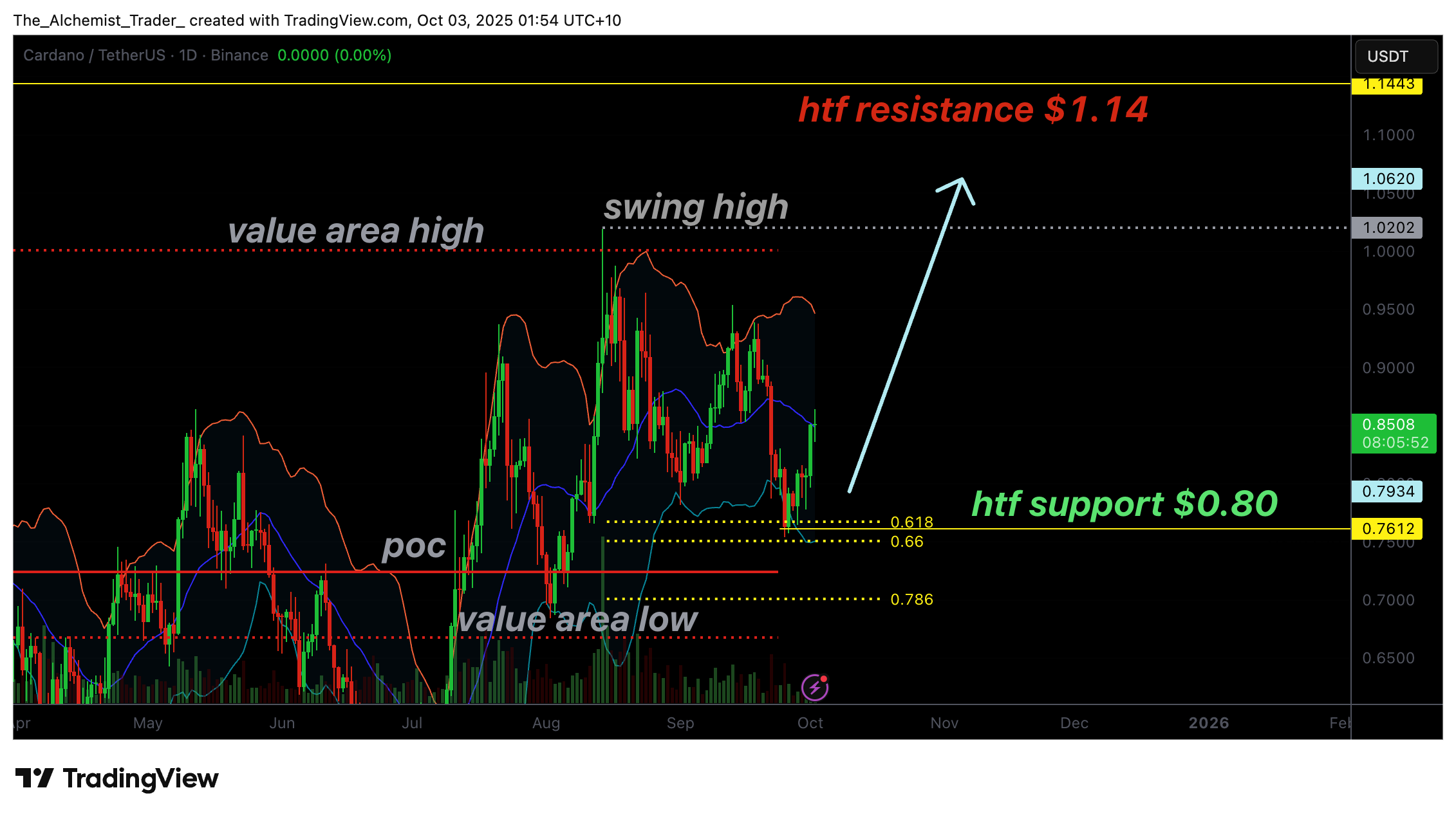 Cardano, by contrast, presents a slightly more layered setup. The coin is reacting to a high-timeframe support zone near $0.80, which is reinforced by both the 0.618 Fibonacci retracement and the point of control. This confluence creates a high-volume area that often acts as a pivot for trend direction. The initial reaction has been bullish, with the price bouncing from this region.