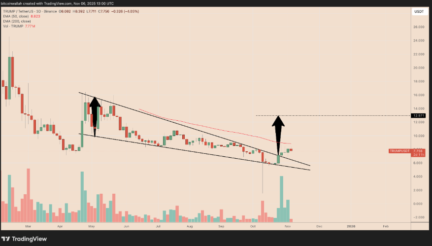 Trump meme coin is currently stuck in a falling wedge pattern on the charts.Technical analysts note this pattern often leads to a breakout bounce if support holds and buyers step in. The wedge structure suggests sellers are losing momentum. If Trump breaks above the upper trendline with volume, it could trigger a 70% surge by year's end, according to some forecasts.The falling wedge offers a potential setup for traders who play technicals, but there's no fundamental reason for growth. If the pattern fails and support breaks, the downside could be sharp. Trump remains pure speculation with high risk and no real use case beyond trading the chart.
