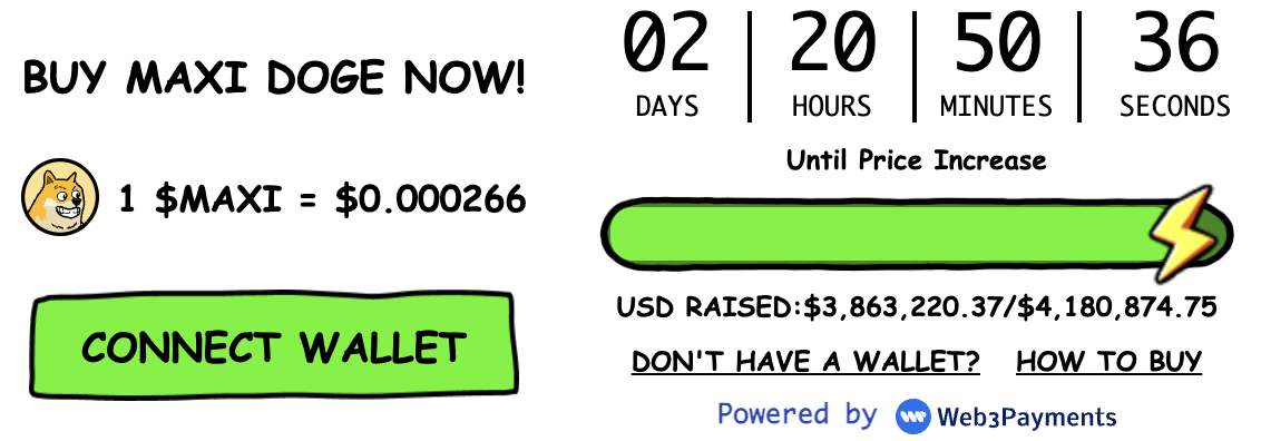 The Maxi Doge presale is raising funds to develop its ecosystem and support marketing efforts as it enters the open market. With $3.8 million already raised, the team has clearly established a strong startup fund, suggesting big things await in the months ahead. Investors can purchase tokens during the presale at a fixed, discounted rate and claim them immediately upon MAXI's listing on exchanges. The current presale price for MAXI is $0.000266, but this rate will increase at the beginning of each new stage, with the next starting in under three days.