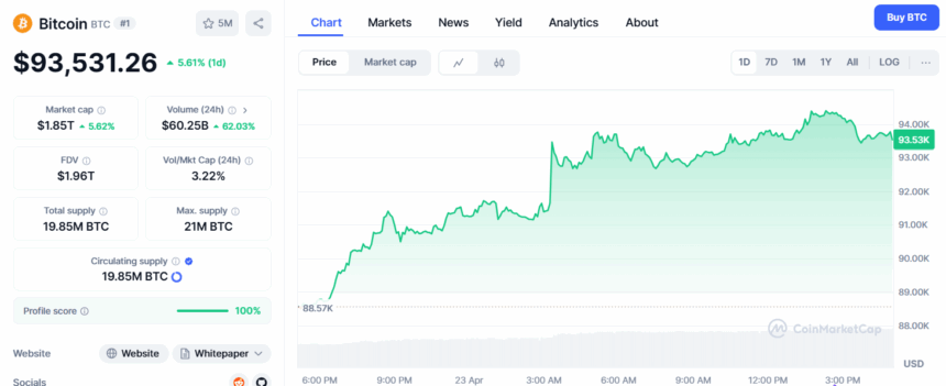 At the time of writing, Bitcoin is trading near $93,531, representing a 5.61% increase over the past 24 hours. Its price accelerated from around $88,000, peaking at $94,391, accompanied by a 60% increase in daily trading volume.