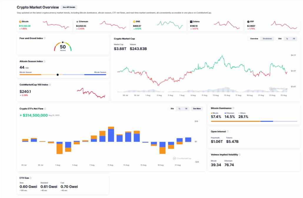 The cryptocurrency market is currently losing its momentum, with a broad sell-off pushing prices down across the board. The total market capitalization has fallen by 3.16% to approximately $3.84 trillion, with a 24-hour trading volume of $228.04 billion.