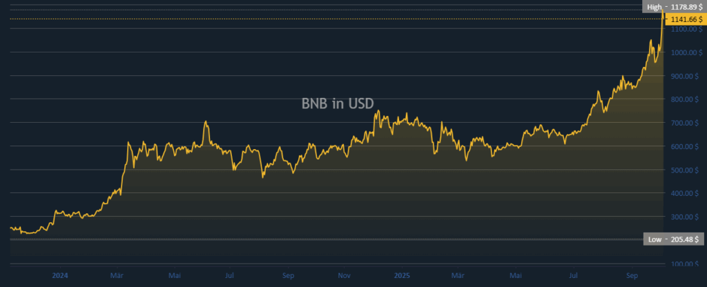 Volume data indicates growing market participation, supporting the strength of this upward trend. The breakout above $1,000 triggered a strong acceleration as sentiment improved across the Binance ecosystem. Despite its steep climb, minor corrections remain possible as traders take short-term profits before the next leg higher.