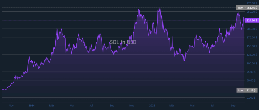Solana has regained momentum, trading near $224.90 after recovering from sharp corrections earlier in 2025. The price structure reveals consistent higher supports since March, confirming the formation of a stable upward channel. Despite earlier volatility, SOL remains one of the stronger-performing layer-1 assets this year.