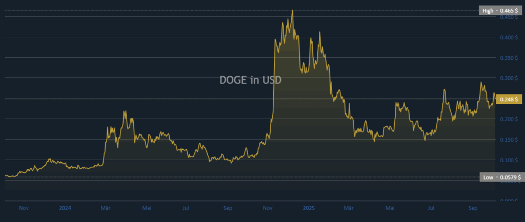 - DOGE maintains a stable consolidation near $0.25, with momentum building for a possible surge toward $0.30 if support holds above $0.20.