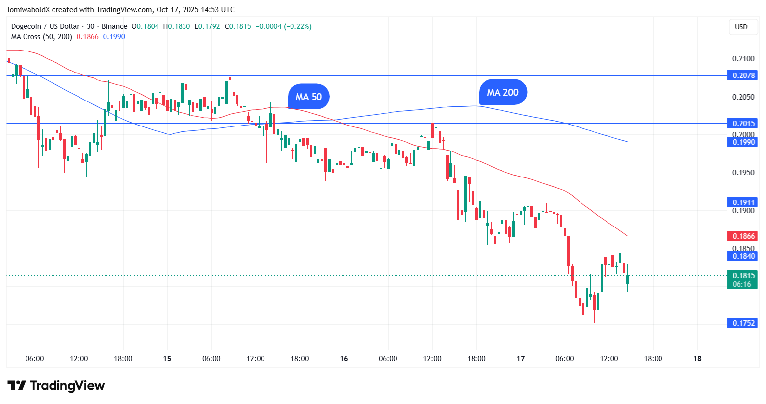 The drop comes as the market’s recovery from last week’s massive liquidation shock appears to have stalled, with the majority of cryptocurrencies falling. Dogecoin also fell, reaching a low of $0.175 early Friday.