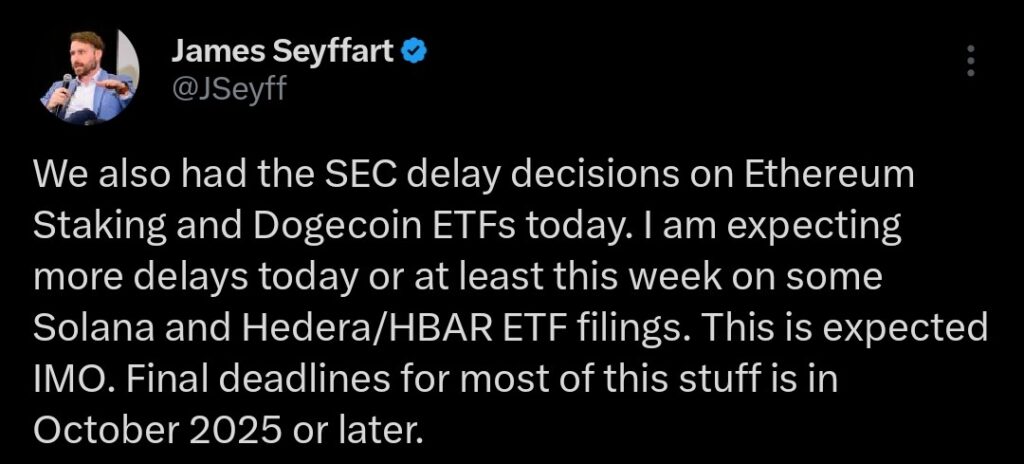Bloomberg ETF analysts James Seyffart and Eric Balchunas offered their perspectives following the SEC's delays. Seyffart noted on X that the SEC had postponed decisions on Ethereum staking and Dogecoin ETFs, suggesting further delays for pending applications, including Hedera and Solana.