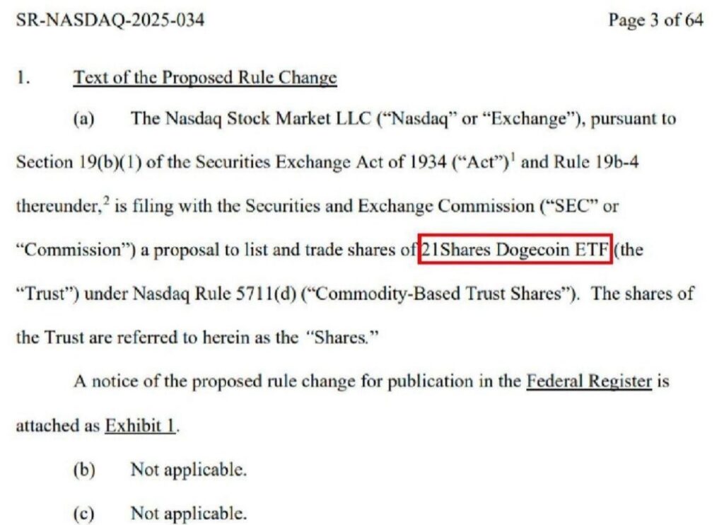 21Shares filed for a Dogecoin ETF to be listed on Nasdaq (SR-NASDAQ-2025-034). Their existing DOGE ETP has seen a 17.74% year-to-date return, managing $1.64 million in assets. The filing was classified under Nasdaq Rule 5711(d) for commodity-based trust shares.