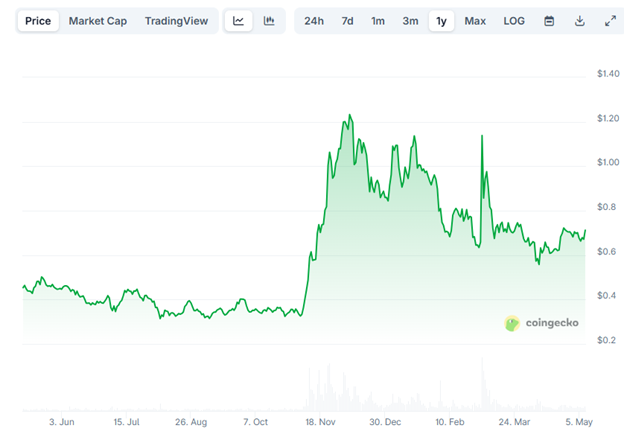 After reaching a multi-year high of $1.23 in December 2024 and a brief spike to $1.14, ADA has declined to $0.71 and has traded sideways for several months. Trading volume is thin, although higher than the same period last year. While a dedicated developer base and promising decentralized applications (dApps) exist, market enthusiasm remains subdued.