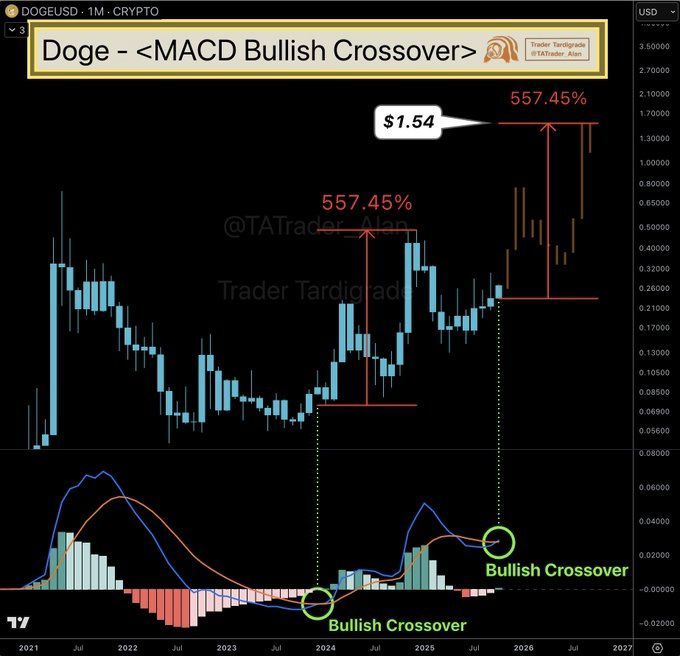 Dogecoin's recent bullish crossover on the Moving Average Convergence Divergence (MACD) has drawn attention from traders. The last time this crossover occurred, DOGE saw a remarkable price surge of over 550%.