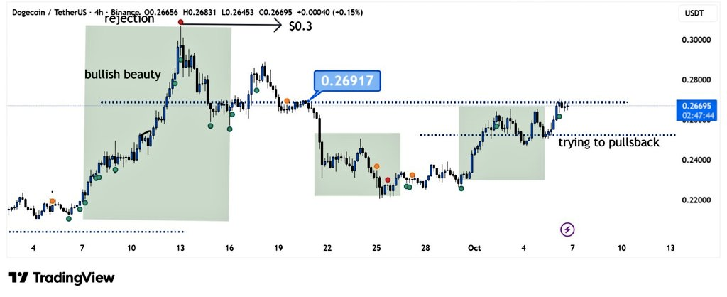 - Dogecoin tests $0.27 resistance, aiming for a possible rally towards $0.30+ target.