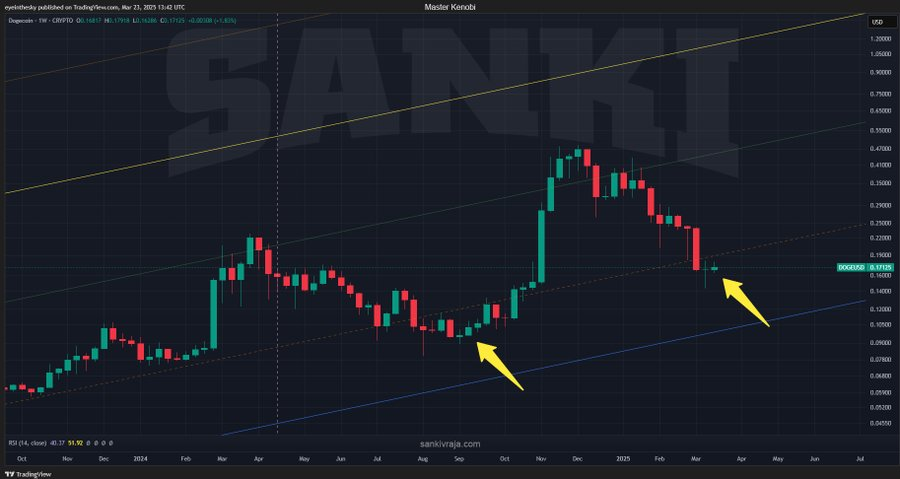 According to MasterKenobi's analysis, Dogecoin experienced price fluctuations, initially rising before a subsequent decline. The price peaked around late 2024, followed by drops in early 2025.