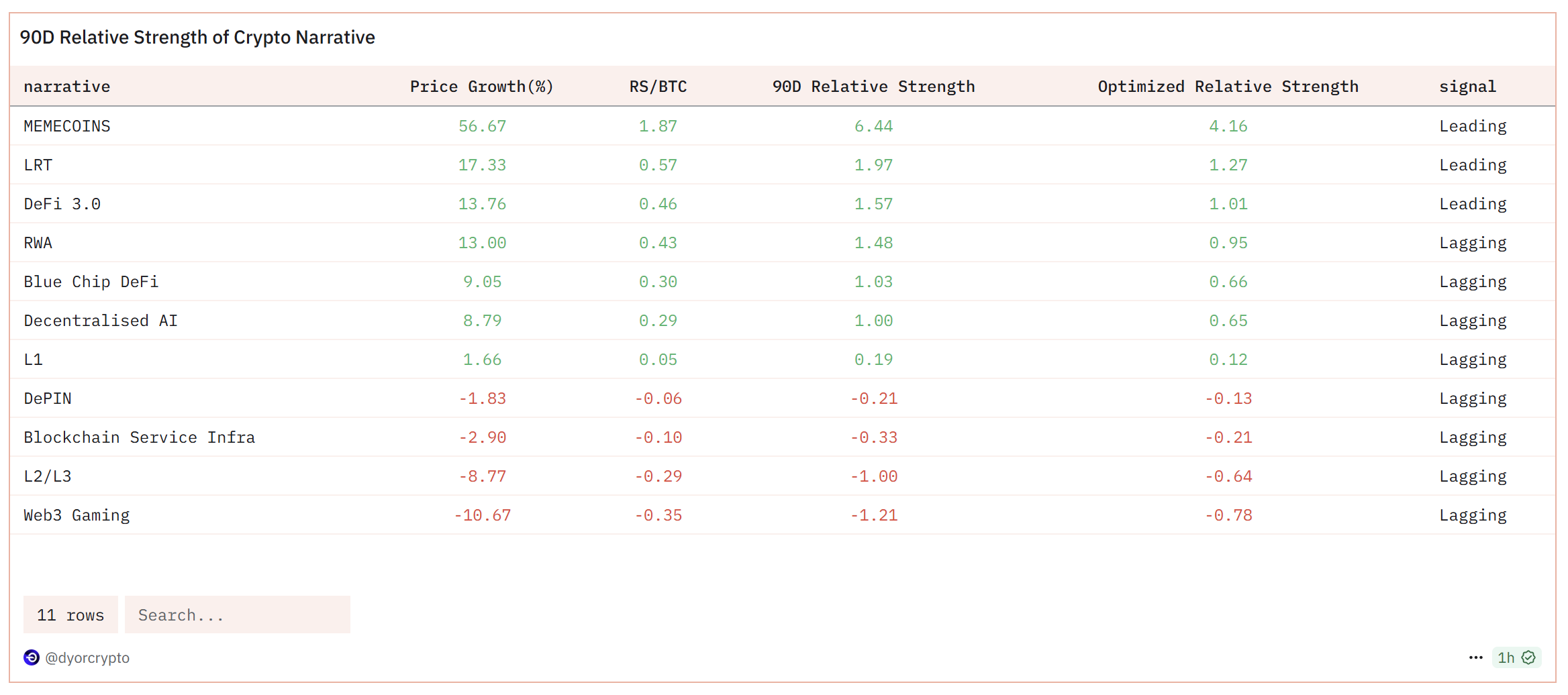 90-day Relative Strength of Crypto Narrative. Source: DYOR/Dune Analytics