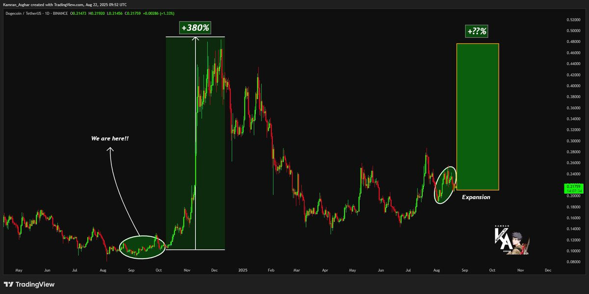 Analyst Kamran Asghar compared Dogecoin’s current structure to a period before a +380% surge in late 2024. The chart shows DOGE in a tight consolidation range, marked by a circle around the $0.21–$0.22 level. The similarity with the earlier accumulation phase raises questions about whether another rally could develop.