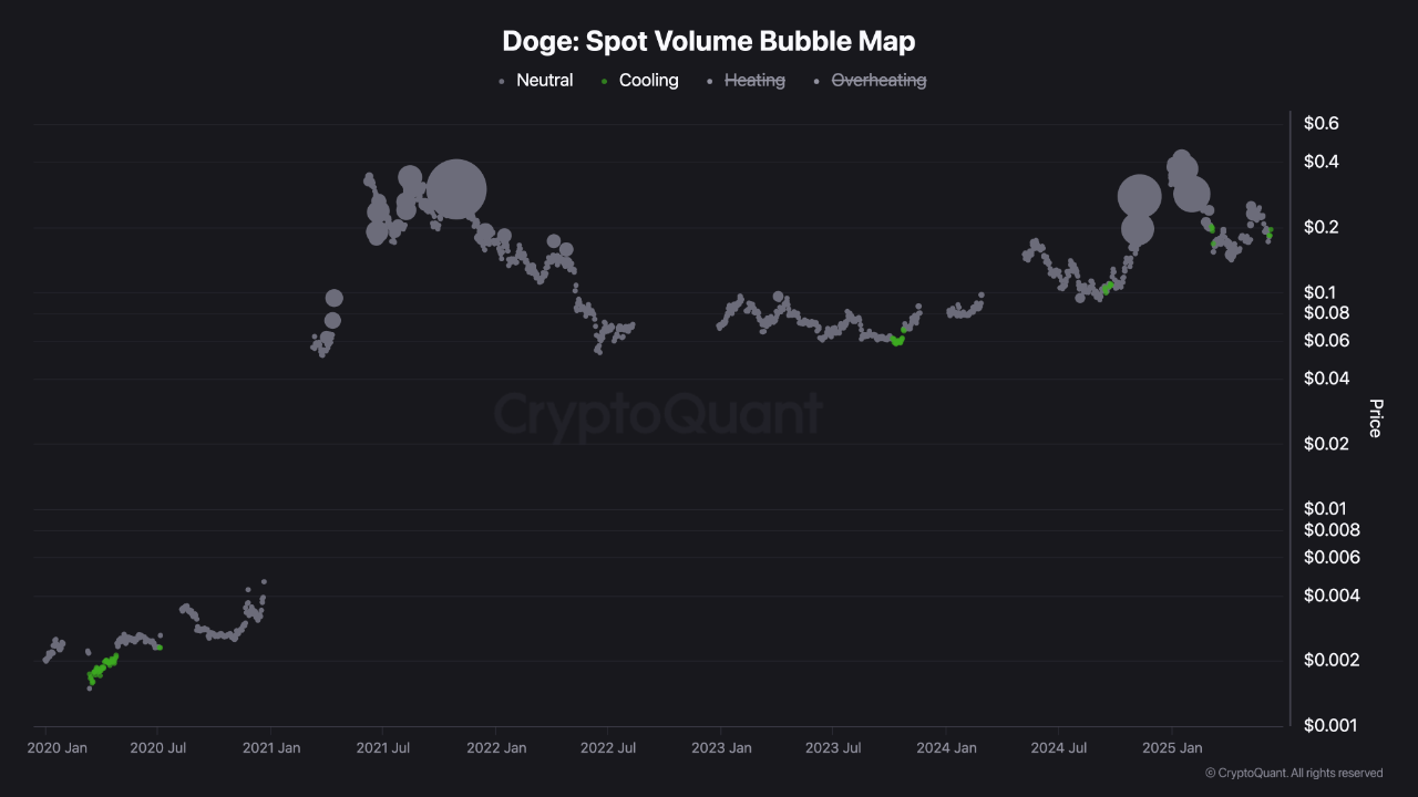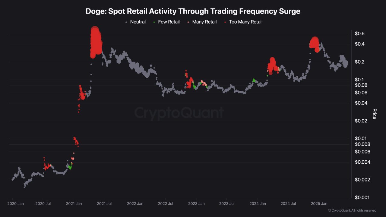 Previous market observations, particularly CryptoQuant’s analysis of “Spot Retail Activity Through Trading Frequency Surge,” underscore a crucial point: the characteristic pattern of high trading frequency from "ant investors"—smaller, individual retail traders—typically associated with Dogecoin's major price peaks, is conspicuously absent in this current upward movement.