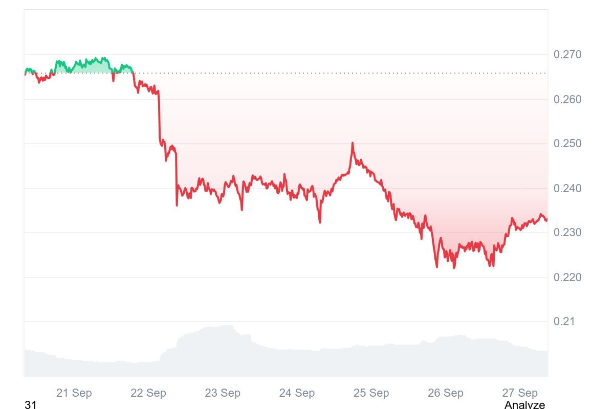 This week, the token was consolidating above its breakout zone, with traders eyeing resistance levels at $0.39 and $0.43-$0.45. However, a fierce correction followed, with DOGE price hotting the floor at $0.22.