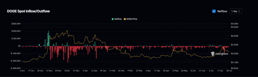 Supporting this trend, exchange net flows have become significantly negative. More DOGE is being withdrawn from exchanges than deposited, indicating that holders are transferring their tokens to cold storage rather than keeping them readily available for sale.