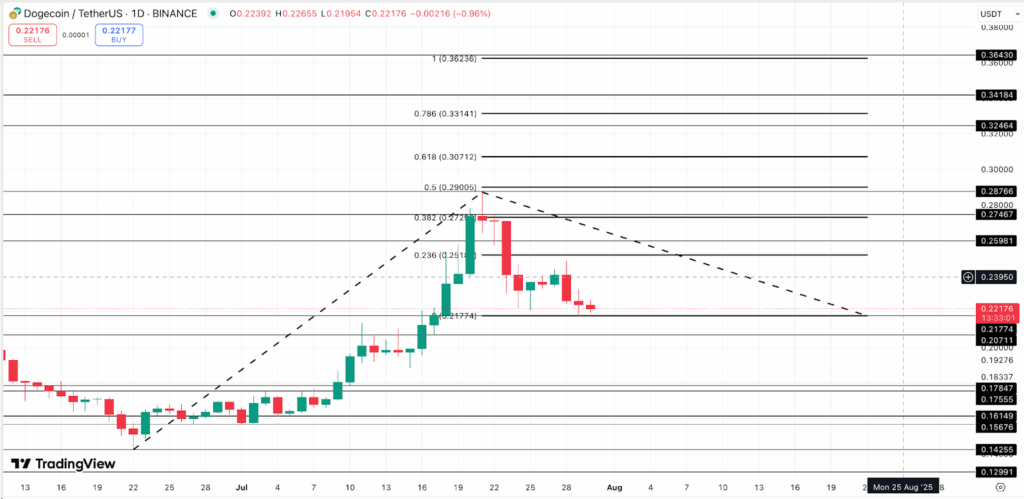 A drop below this level could weaken the bullish structure and potentially drag DOGE lower towards $0.20 or $0.19.