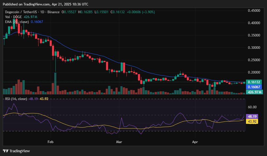 Currently trading at $0.16132, Dogecoin is consolidating around a key horizontal support level. Since late March, it has traded sideways between $0.14 and $0.16, suggesting a period of accumulation following a prolonged downtrend. The price is currently testing the 20-day Exponential Moving Average ($0.16067) and appears to be aiming for the $0.20 psychological resistance level (established and retested in early March).
