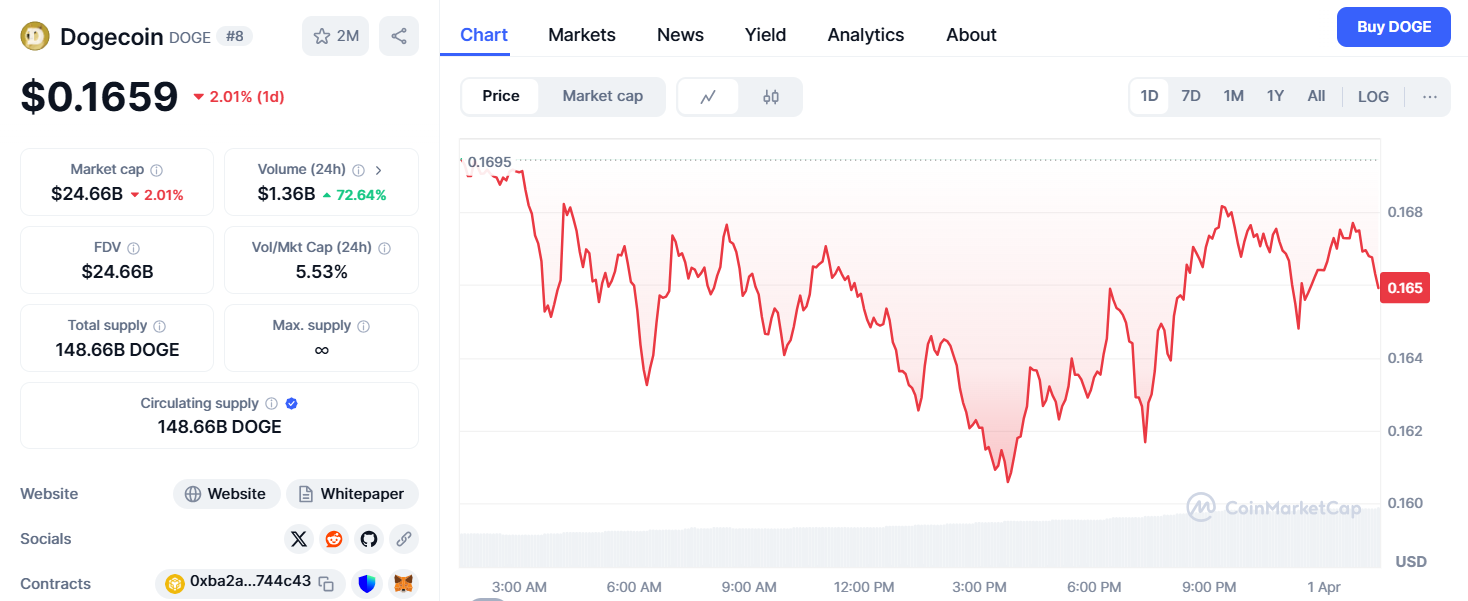 Elon Musk's statement that the U.S. government has no plans to use Dogecoin (DOGE) has caused the cryptocurrency's price to drop over 5%. Investor hopes for continued price increases were dashed following Musk's comments at a Wisconsin town hall. He explicitly stated that, to his knowledge, there are no plans for the Department of Government Efficiency (D.O.G.E.) to integrate Dogecoin into government operations. This announcement led to a swift price decline, with DOGE falling over 5.3% within hours. At the time of writing, DOGE is trading near $0.1658, having dipped as low as $0.1605 from a daily high of $0.1695.