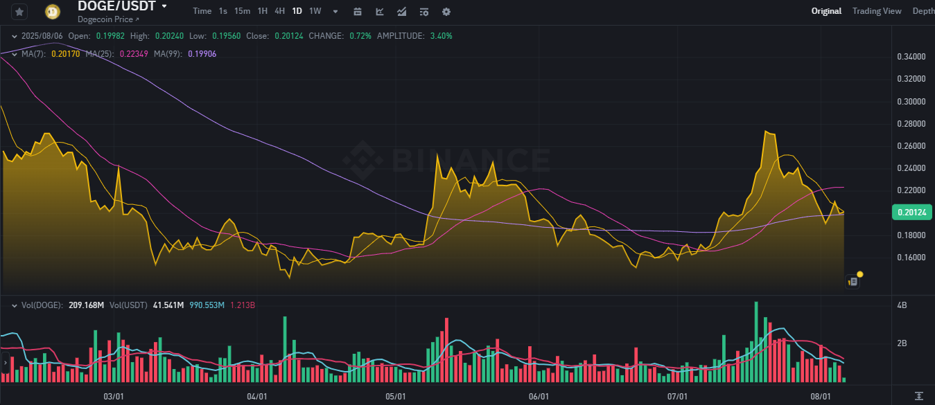 DOGE is demonstrating resilience at $0.20 despite reduced trading activity. Daily volume has decreased from previous peaks, but the price structure remains intact. The DOGE price continues to consolidate, supported by the recent whale activity.